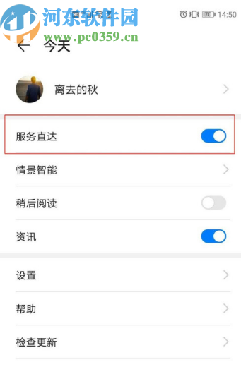 4.最后在今天这个设置界面,我们就可以看到服务直达功能了,点击它后面的开关关闭这个功能即可。
