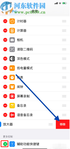 4.之后在自定控制界面,我们可以看到所有可以使用的图标,点击减号将该图标移除,点击加号的话就添加该图标到控制中心,大家根据自己的需求设置即可。