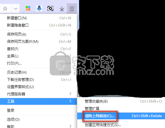 3.点击打开三条横线图标之后,我们就可以看到下图中的界面了,然后将鼠标移动到工具选项,之后就会在选项中出现清除上网痕迹这个选项,然后点击它。