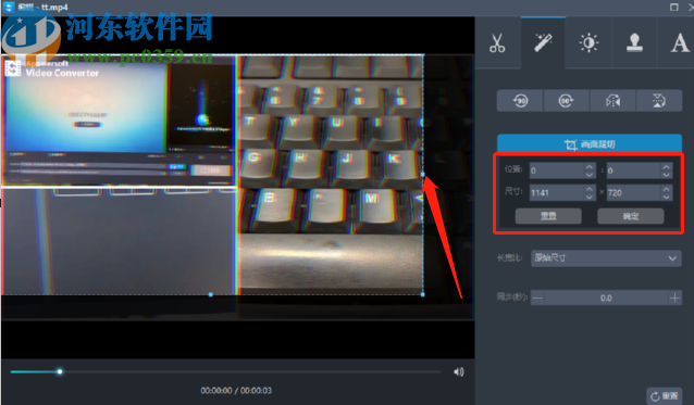 5.点击画面裁切之后视频文件的周围会出现一些虚线,然后我们移动虚线边框即可裁切视频画面,同时也可以直接在右边输入需要裁切的画面大小。