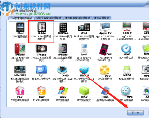 3.点击选择好文件之后,下一步就是选择要转换的视频格式,我们切换到iPad常用格式之后,选择iPad高清视频格式,然后点击下一步按钮。
