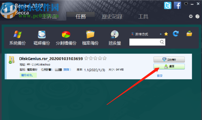 5.如果点击立即备份之后等待软件备份完成就可以在任务界面中看到已经备份好的文件了,如下图中所示,如果发现找不到这个文件了,点击还原按钮即可。