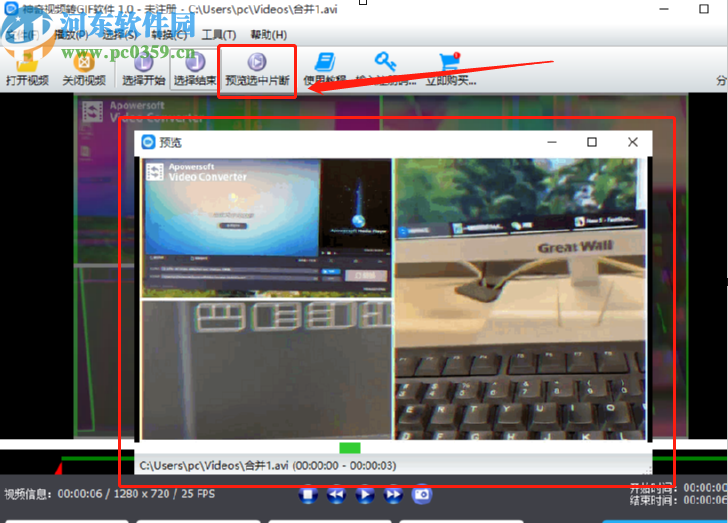 5.视频的开始时间和结束时间都选择完成之后点击界面中的预览选中片段按钮可以预览转换成gif图片之后的样子。