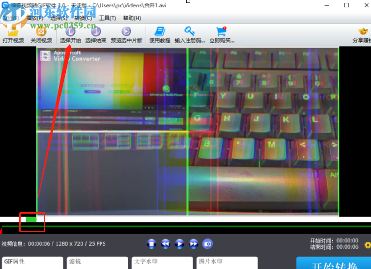 3.点击打开按钮之后视频文件就成功被添加到软件界面中了,然后我们拖动界面下方的绿色方块可以移动选择gif动图的开始时间。