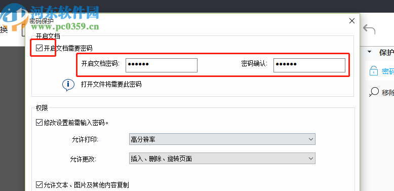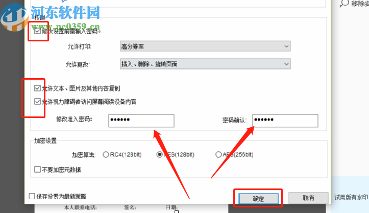 5.另外我们还可以勾选权限这个模块中的一些关于修改PDF文件的权限,选择相关权限之后设置好密码并点击下方的确定按钮即可。