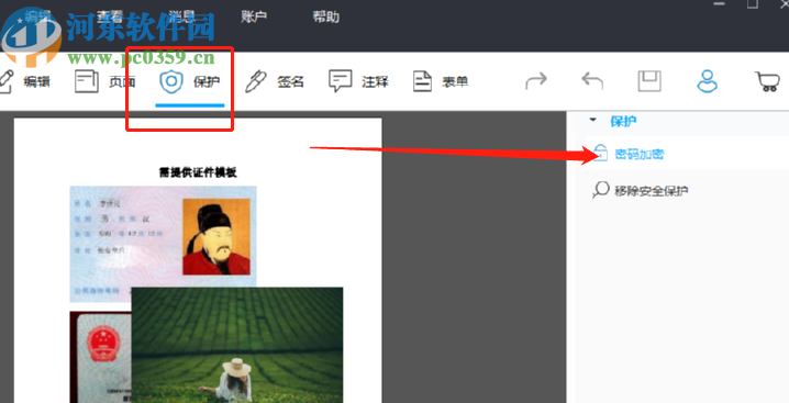 3.将要加密的PDF文件添加到软件界面之后,下一步就是在界面的功能中找到并点击保护这个功能模块,然后点击右侧的密码加密功能。