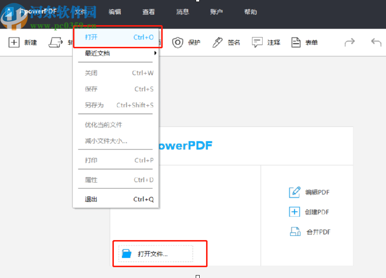 1.首先第一步我们打开软件之后在软件的界面上方点击文件,然后再点击打开选项来选择添加PDF文件,也可以点击下方的打开文件按钮来选择PDF文件。