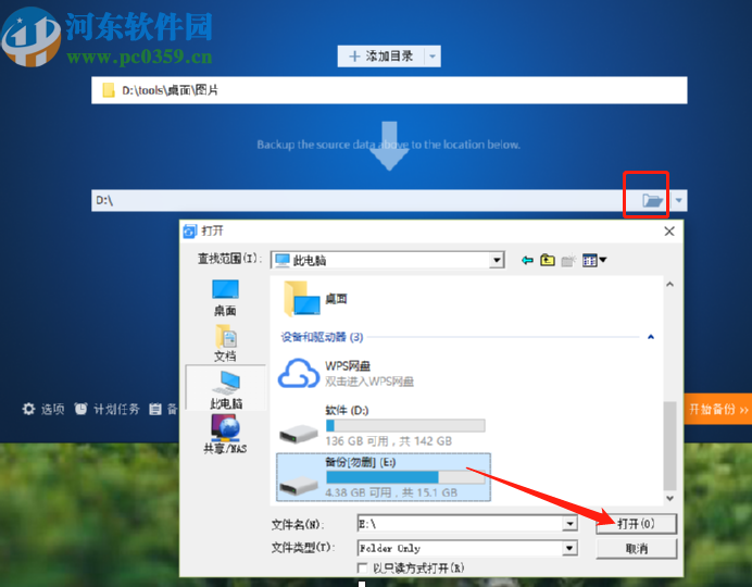 4.点击打开按钮之后就添加成功了,下一步点击界面中框出的文件夹图标,然后选择文件夹备份的目标位置,也就是文件夹要备份到哪里。