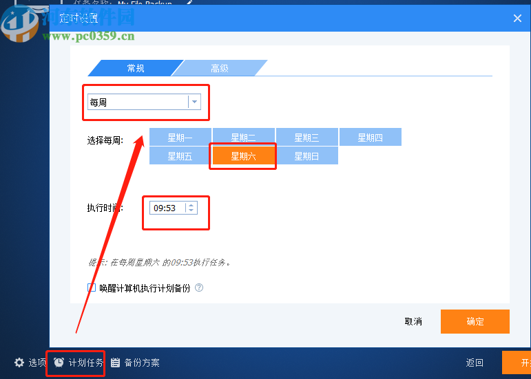 5.设置好文件夹的备份位置之后下一步点击界面左下角的计划任务这个功能选项,然后在出现的界面中就可以设置备份的时间了,可以选择每周进行一次备份,选择每周几,然后再选择备份的执行时间。
