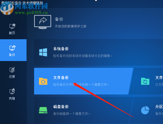 1.首先第一步我们打开软件之后在软件的主界面中切换到备份这个功能模块,然后在备份界面中点击文件备份这个功能。