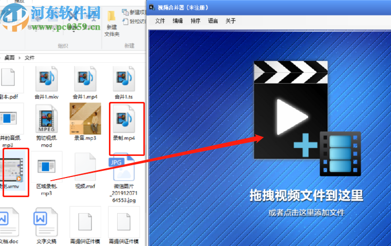 1.首先第一步我们打开软件界面之后同时打开合并视频所在的文件夹,打开之后选中要合并的视频将它们拖拽到软件界面中。