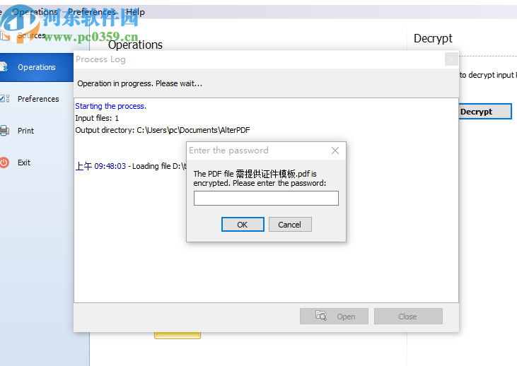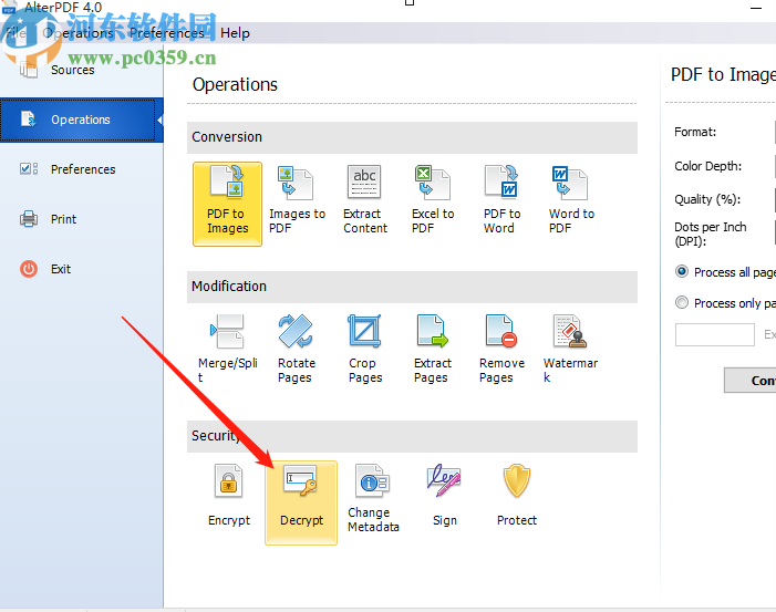 3.点击打开将文件成功添加到软件界面之后,下一步是在左边切换到Operations这个功能模块,然后点击其中的Decrypt这个功能按钮。