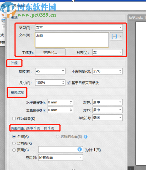 4.点击添加之后就会来到添加水印的界面了,在这个界面中我们选择文字水印之后,输入水印的内容,可以对字体字号、外观、布局和页面的应用范围进行选择,大家根据自己的需求设置即可。