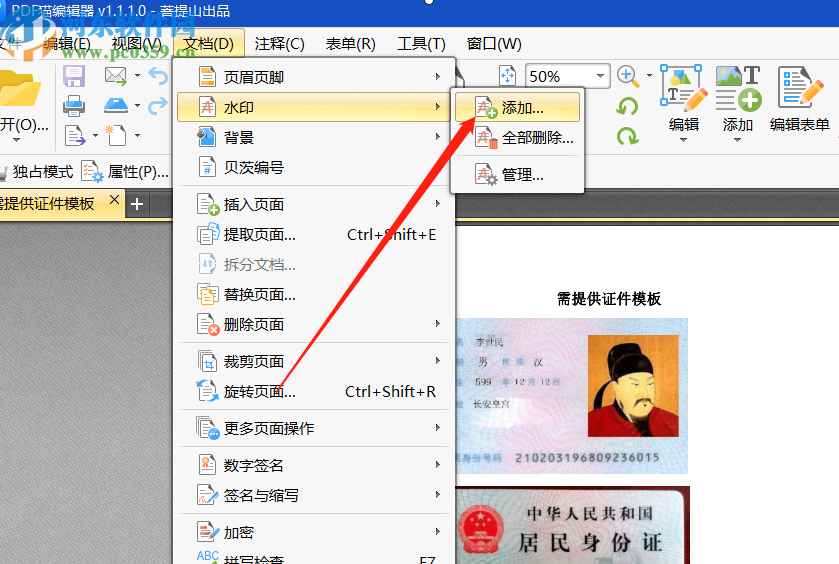 3.成功将PDF文件添加到软件界面之后,下一步就是在界面中点击文档这个功能,然后在出现的界面中选择水印后面的添加功能。