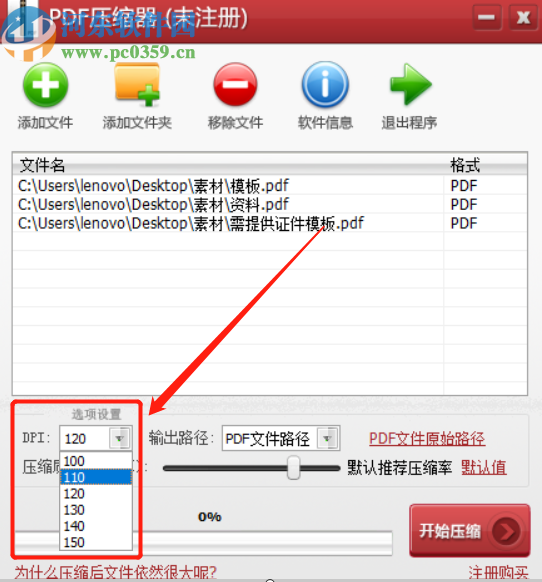 3.紧接着下一步软件就会自动识别文件夹中的PDF文件了,全部识别出来之后我们就可以在下方的选项设置界面来设置压缩的DPI值了。