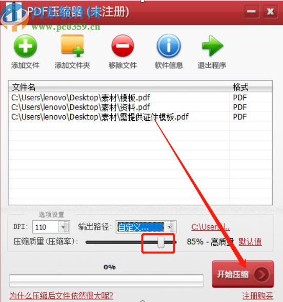 5.点击确定按钮之后下一步我们就可以在界面中的压缩质量这里来自定义调整了,调整完成之后点击开始压缩按钮即可。
