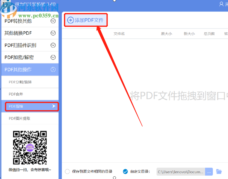 2.点击打开PDF其他操作功能选项之后,在其中点击选中PDF压缩这个功能,然后在功能界面中点击添加PDF文件按钮。