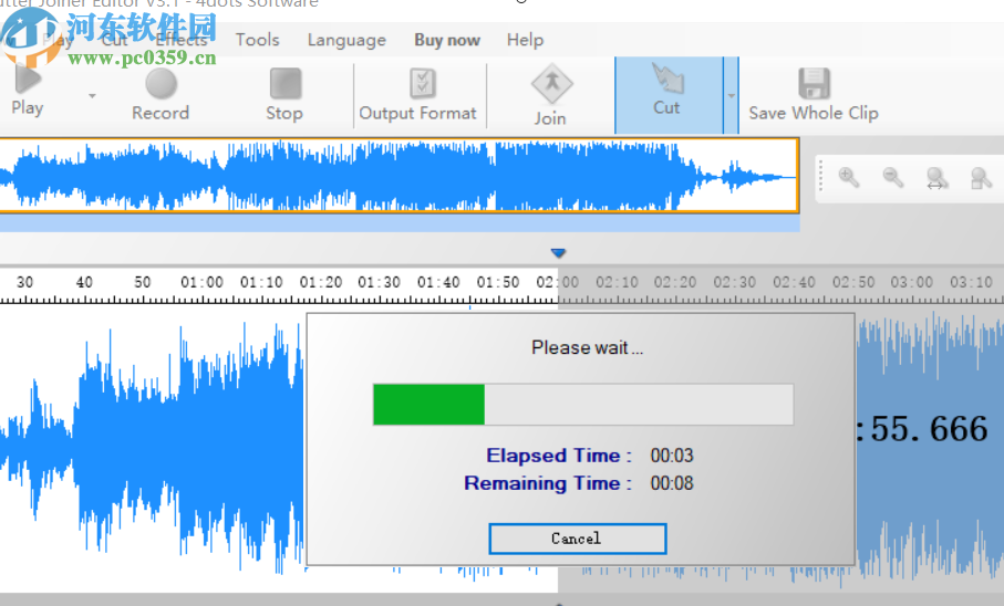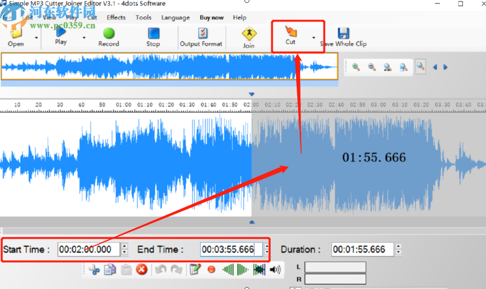 4.然后我们根据个人的需求设置好要分割音频片段的开始时间和结束时间之后,可以看到选取出来的音频片段,最后点击上方的Cut这个功能按钮。