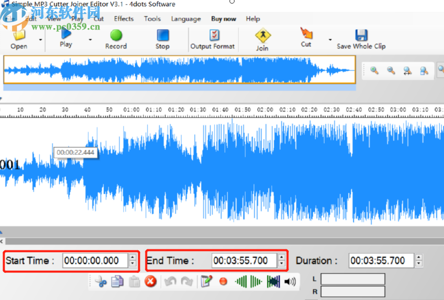 3.等到MP3音频文件被成功添加到软件界面之后,我们在界面中可以看到有开始时间和结束时间可以选择设置。