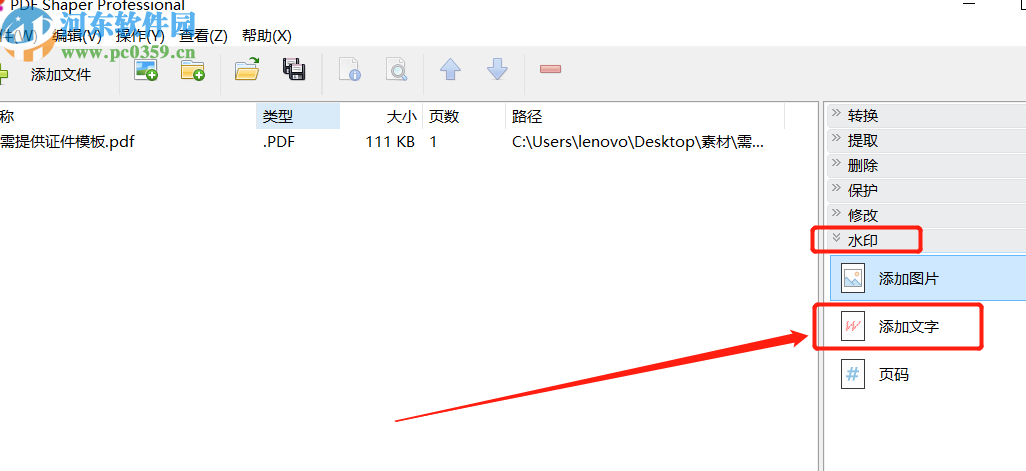 3.将PDF文件添加到软件界面之后,下一步是在左边切换到水印这个功能,然后点击添加文字这个功能选项。
