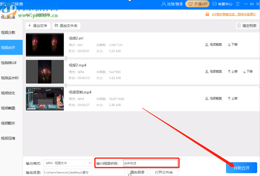 5.最后我们只需要在输出视频名称这里输入合并视频的名称,然后点击界面右下角的开始合并这个功能按钮就可以开始合并文件的操作了。