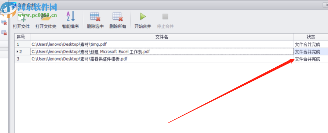 5.最后点击确定按钮软件就会自动开始合并文件的操作了,紧接着我们在界面中的状态这一栏可以看到文件合并完成的提示。