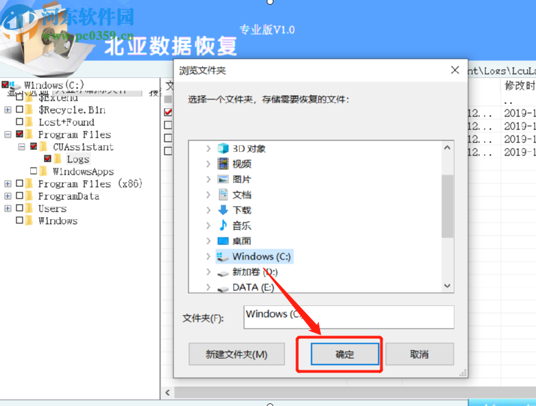 5.点击恢复按钮之后我们还需要在出现的界面中选择文件要恢复的位置,选择之后点击界面中的确定按钮即可进行恢复。