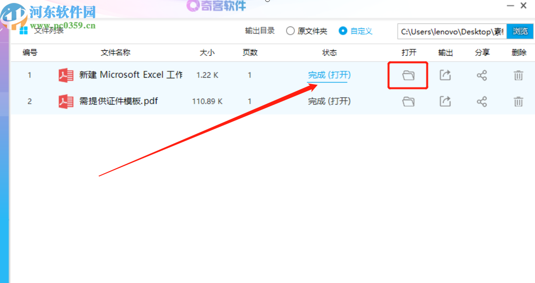5等到合并操作完成之后我们在界面的状态一栏中可以看到显示状态为完成,然后点击打开下面的文件夹图标可以打开合并之后的文件查看。