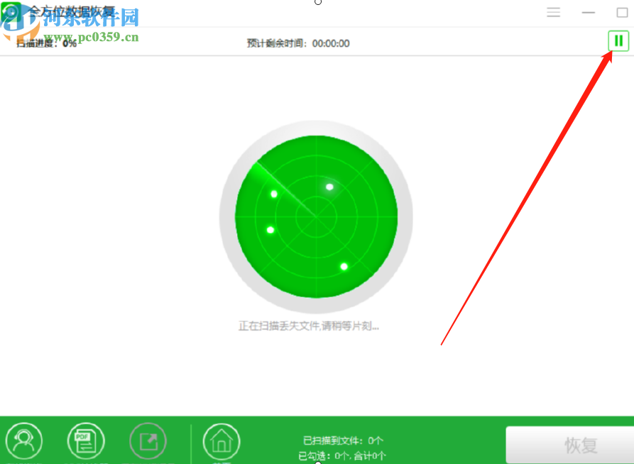 4.选择好扫描类型之后点击下一步按钮就会进入到扫描操作中了,然后在界面中可以看到扫描进度,右上角的按钮可以控制暂停扫描或停止扫描。