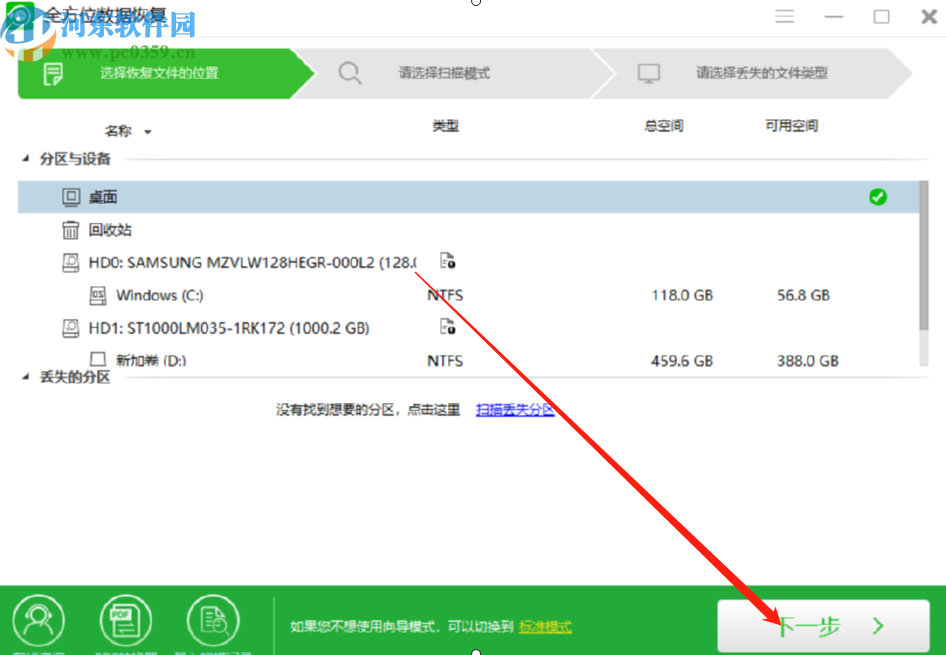 2.点击下一步按钮之后会进入到选择扫描模式的界面,然后我们就根据个人的情况选择恢复的扫描模式,选择之后点击下一步。