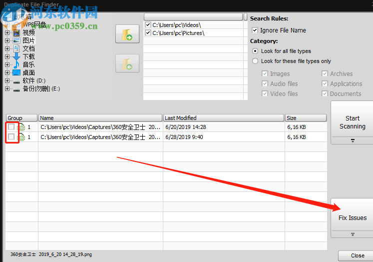 5.等到扫描完成之后在界面中就可以看到扫描出来的重复文件列表了,然后我们点击勾选这些重复文件,点击右下方的Fix Issues按钮即可让软件智能的选择删除修复重复文件。
