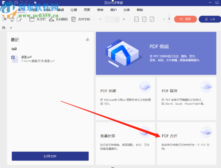 1.首先第一步我们打开软件之后在软件界面中找到合并这个功能,找到之后用鼠标点击它进入到PDF合并功能界面中。