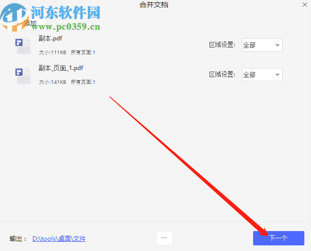 6.点击确定按钮之后输出储存路径就选择完成了,最后我们点击界面右下角的下一个按钮即可开始合并操作。