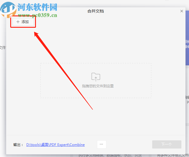 2.进入到PDF合并功能界面之后会出现一个合并文档的窗口,我们在其中需要点击添加这个功能按钮,点击添加之后即可选择要合并的PDF文件。
