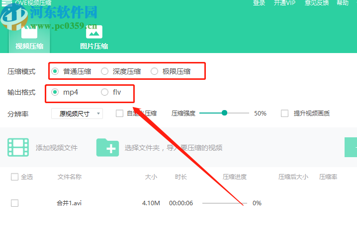3.紧接着下一步我们就将视频文件成功添加到软件界面中了,然后我们可以对压缩模式、输出格式进行选择设置。