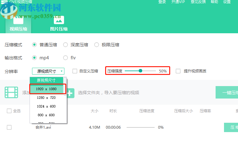 4.设置好压缩的模式和格式之后,我们还可以对压缩文件的分辨率进行选择设置,打开下拉列表之后自定义选择即可,除此之外还可以调整压缩强度。