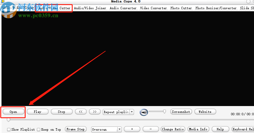 1.首先第一步我们打开软件之后在上方切换到音频/视频剪切功能界面,然后点击界面左下方的Open按钮,点击之后即可添加文件。