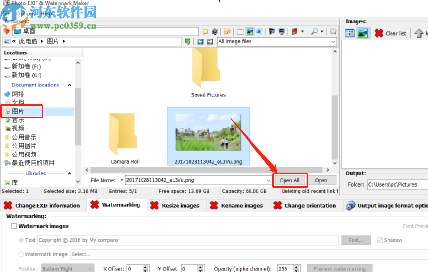 1.首先第一步打开软件之后在软件界面的左边选中图片所在的文件夹,然后在中间的界面中找到要添加水印的图片,点击Open All按钮可以将文件夹中的所有图片加载到软件中。