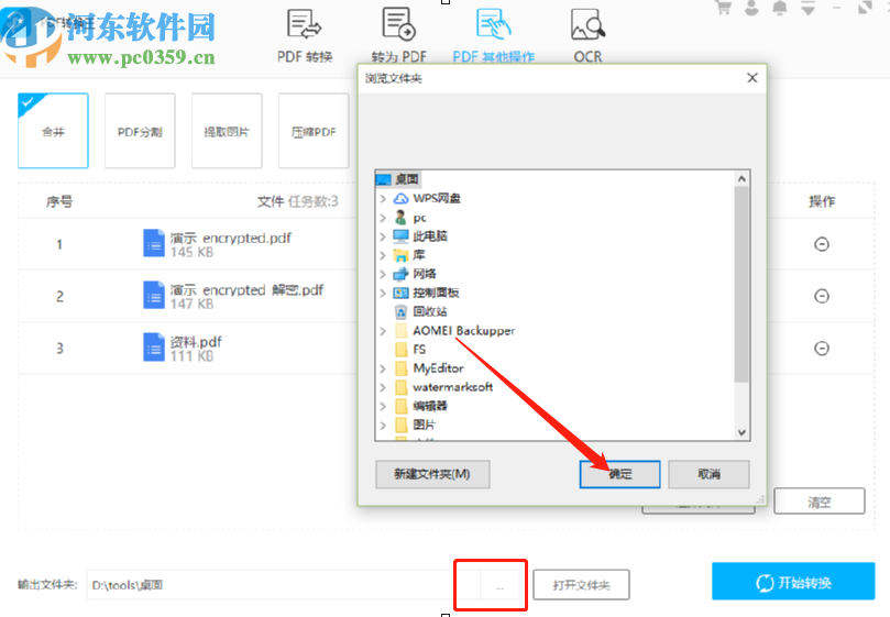 4.点击选择完要合并的PDF文件之后,下一步就是在界面的下方点击输出文件夹的三点按钮,点击之后可以对文件合并之后的输出位置进行选择。