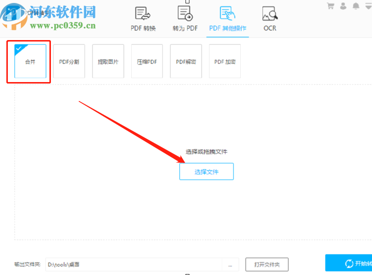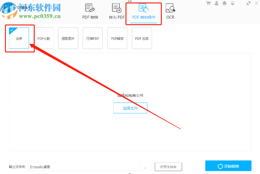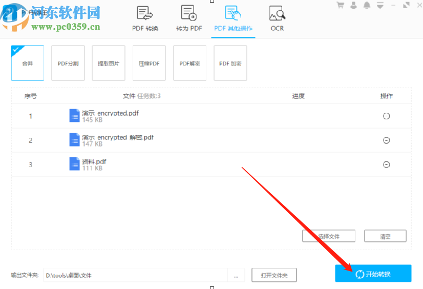 5.设置好输出位置之后,最后一步我们就可以点击界面右下角的这个开始转换按钮来开始合并选择的这些PDF文件了。