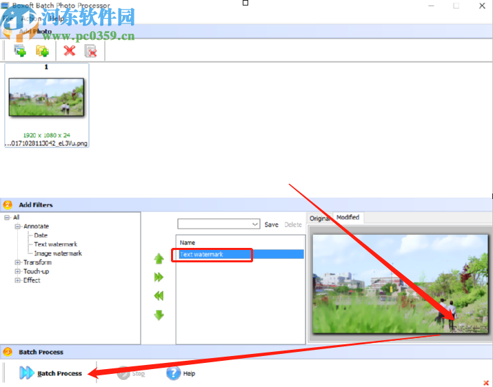 5.点击OK按钮之后回到软件的主界面中,在右下角可以看到水印添加之后的效果,再点击左下角的Bach Process按钮即可开始为图片添加水印。