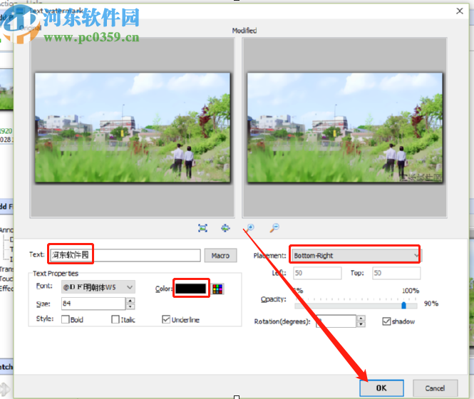 4.打开编辑文字水印的界面之后,在其中输入水印的文字内容,然后设置字体字号、颜色、位置等,根据需求设置完成之后点击下方的OK按钮。