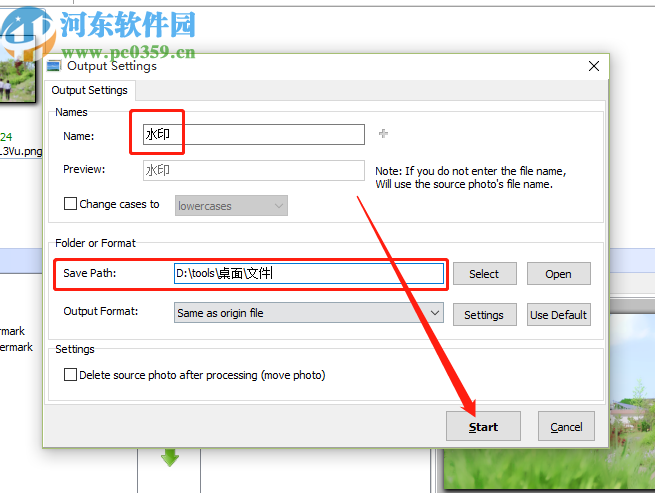 6.点击Bach Process开始为图片添加水印之后,我们在出现的输出选项界面中,输入文件的名称和选择保存位置之后,点击Start按钮即可开始添加水印的操作。