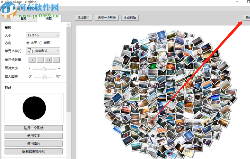 6.点击这个生成拼贴按钮之后软件就会将我们选择的图片文件进行生成所选形状的拼贴,如下图中所示,然后我们点击右上角的导出图片按钮。