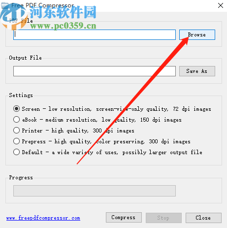 1.首先第一步我们打开软件之后在界面中点击Browse这个浏览按钮,点击之后即可添加要压缩的PDF文件。