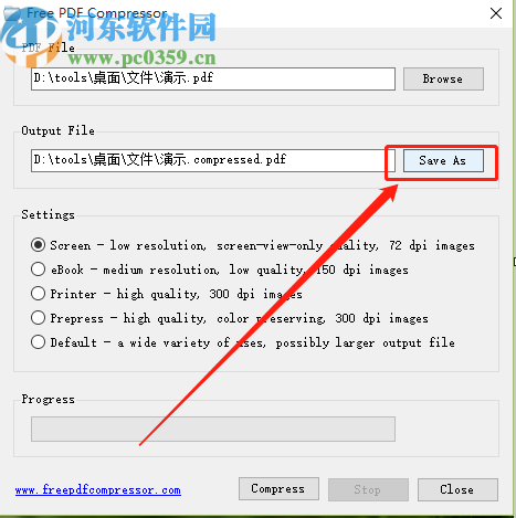 3.点击选择好要压缩的PDF文件之后,下一步在输出文件夹这里点击Save as按钮,点击之后可以选择文件的输出路径。