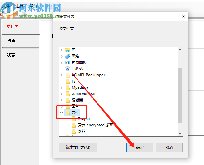 3.点击源文件夹按钮之后,会打开一个选择文件夹的界面,在这个界面中选中要提取文字的PDF文件所在的文件夹之后,点击右下角的确定按钮。