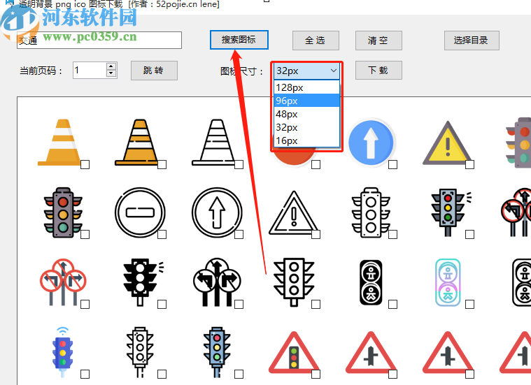 3.等到搜索完成之后在界面中就会显示相关的图标选项了,如果尺寸不合适的话我们点击打开图标尺寸进行选择,选择之后再次点击搜索图标就可以出现我们想要的尺寸图标了。