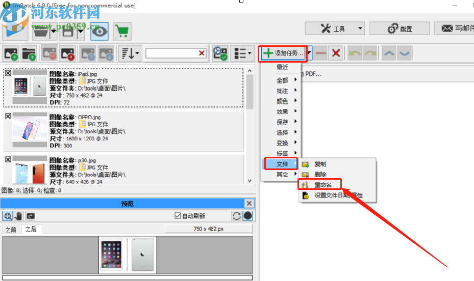 3.点击打开按钮之后图片就全部添加进来了,然后我们需要点击右边的添加任务按钮,在出现的选项中选择文件,再点击它下面的重命名选项。