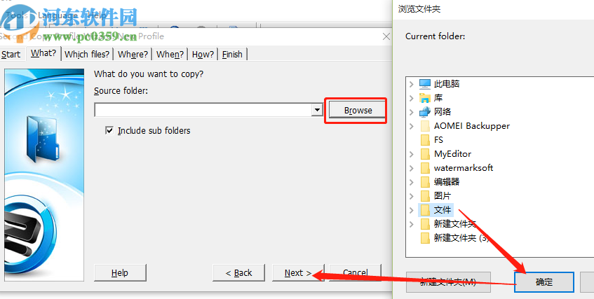 3.进入到下一步之后我们就需要选择进行备份的文件了,点击浏览按钮在出现的界面中选中想要备份的文件之后点击确定按钮,然后再点击下一步按钮。